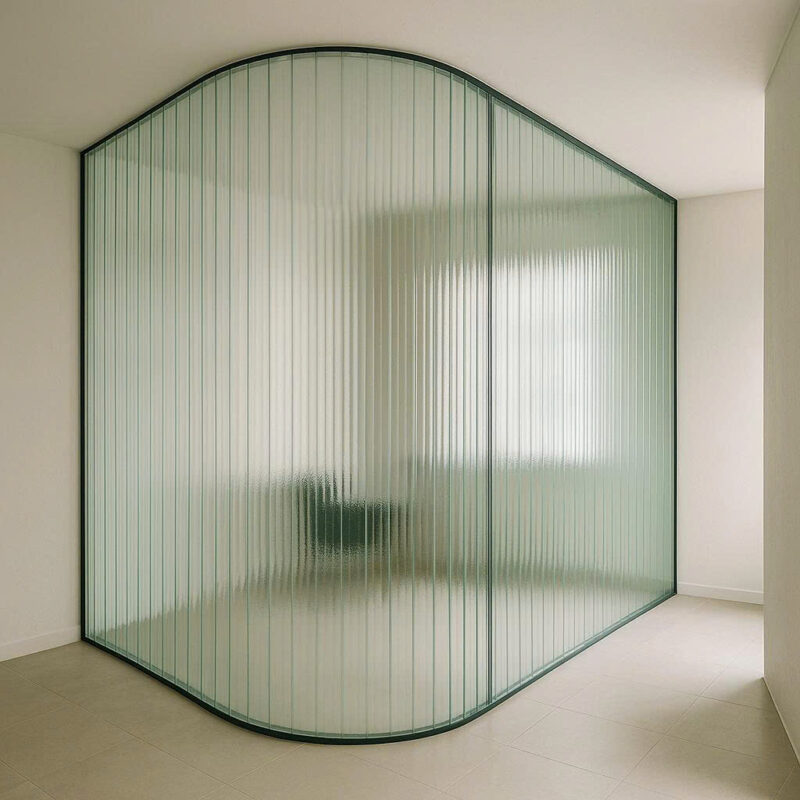 Đây là ứng dụng phổ biến nhất của kính uốn sọc. Vách ngăn kính uốn sọc không chỉ phân chia không gian hiệu quả mà còn tạo điểm nhấn kiến trúc độc đáo. Chúng thường được sử dụng trong các phòng khách, phòng ăn, phòng làm việc hoặc phòng ngủ để tạo sự phân tách tinh tế mà không làm mất đi sự liên kết của tổng thể. Cửa kính uốn sọc cũng mang lại vẻ đẹp sang trọng, hiện đại cho lối vào, cửa tủ hoặc cửa phòng tắm.